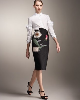 I think that Caroline Herrera’s collection from 2011, based on 18th century botanicals fits the bill ideally. The pieces are reminiscent of Mrs. Delaney’s paper mosaicks and yet have a fresh and current appeal to them. The skirt is paired with a crisp white blouse and t-strap sandals.