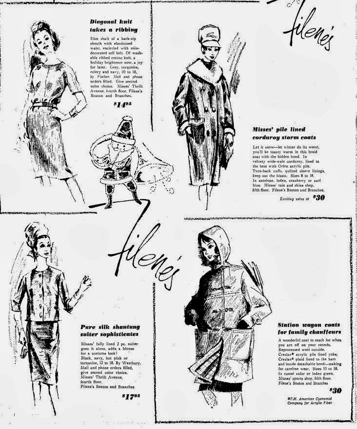 Coat shopping was an event at our house. Mom took us to Jordan Marsh or Filenes on fall Saturdays that always seemed to have newly crisp and clean air, a hint of what was to come. We tried on eons of coats; some plain, some fancy, some with large leather buttons or brass military ones. If Mom got confused, there always seemed to be a nice attractive mature saleslady with glasses on a chain around her neck, pencil in her chignon and thick charge book nearby. She helped our arms get in and out of all kinds of sleeves, buttoned us, and led us to the illuminated three way mirror. We could get just one coat each so it had to have room to grow and be sturdy enough to last into the next year. Salesladies understood that coat shopping was serious business too.