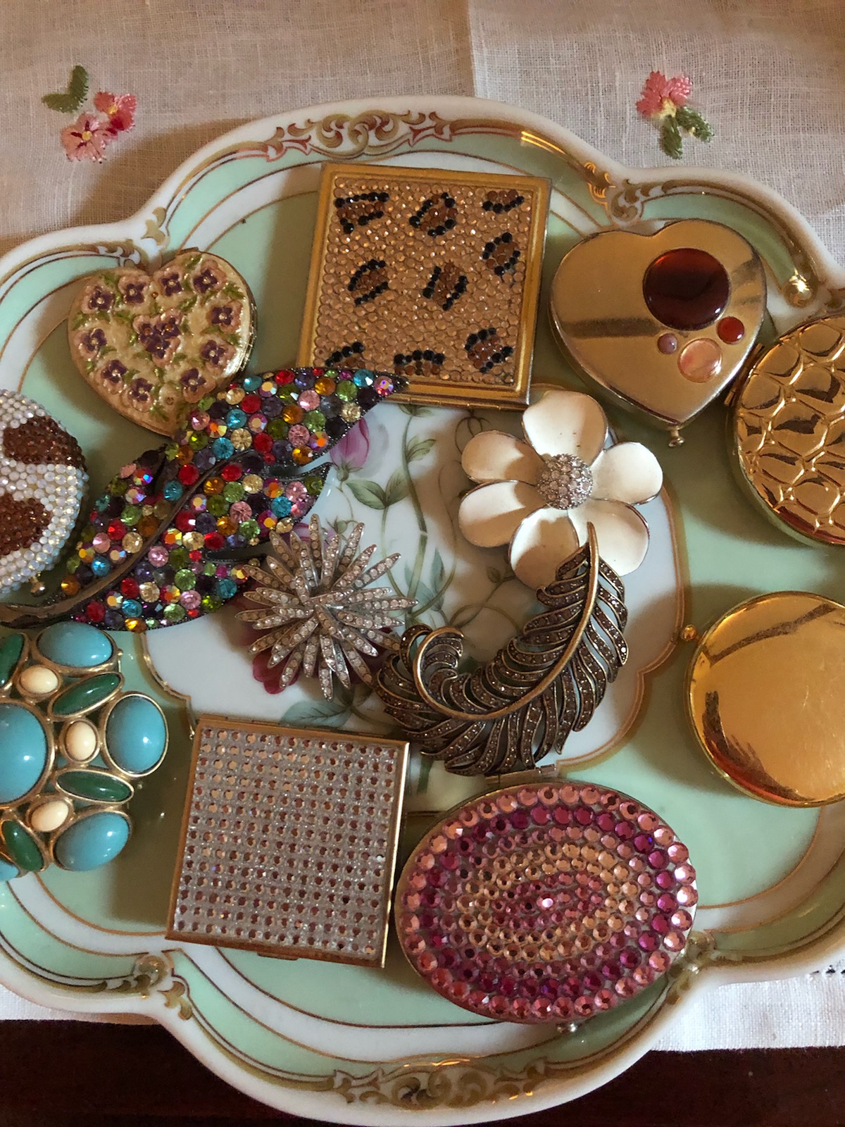Compact collecting is quite popular and flea markets, junk shops, and antique stores have their share of vintage selections.  The picture below is my sisters’ eclectic treasure trove of compacts that she displays on a tray in her bedroom.  It’s always fun to peek just to see if there are any new additions.