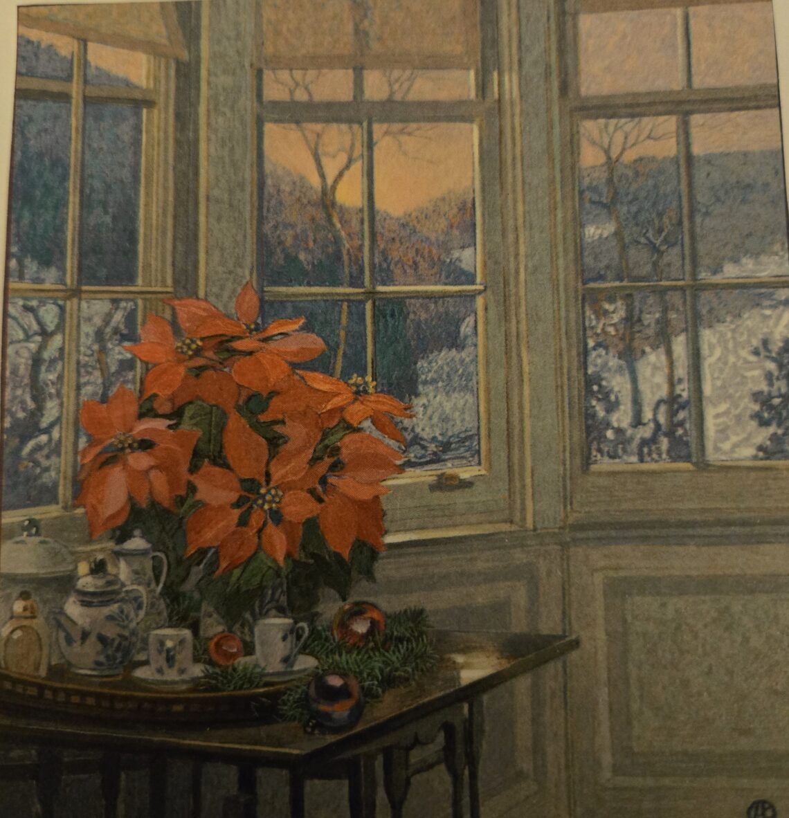 This is a Christmas card I received years ago, yet it has never loosened its hold on me. I was first drawn to it by the blue chinoiserie, so beautiful against the red poinsettia—a color pairing I have always loved. But it is the light that truly captured me: the gloaming outside, the waning afternoon settling over snow. Not bleak, not sorrowful, but quietly beckoning in a way that feels almost homesick. I am moved by the contrast—the warmth and beauty within set against the cold hush beyond the windows—an image that perfectly mirrors the tender longing that so often accompanies the holidays.